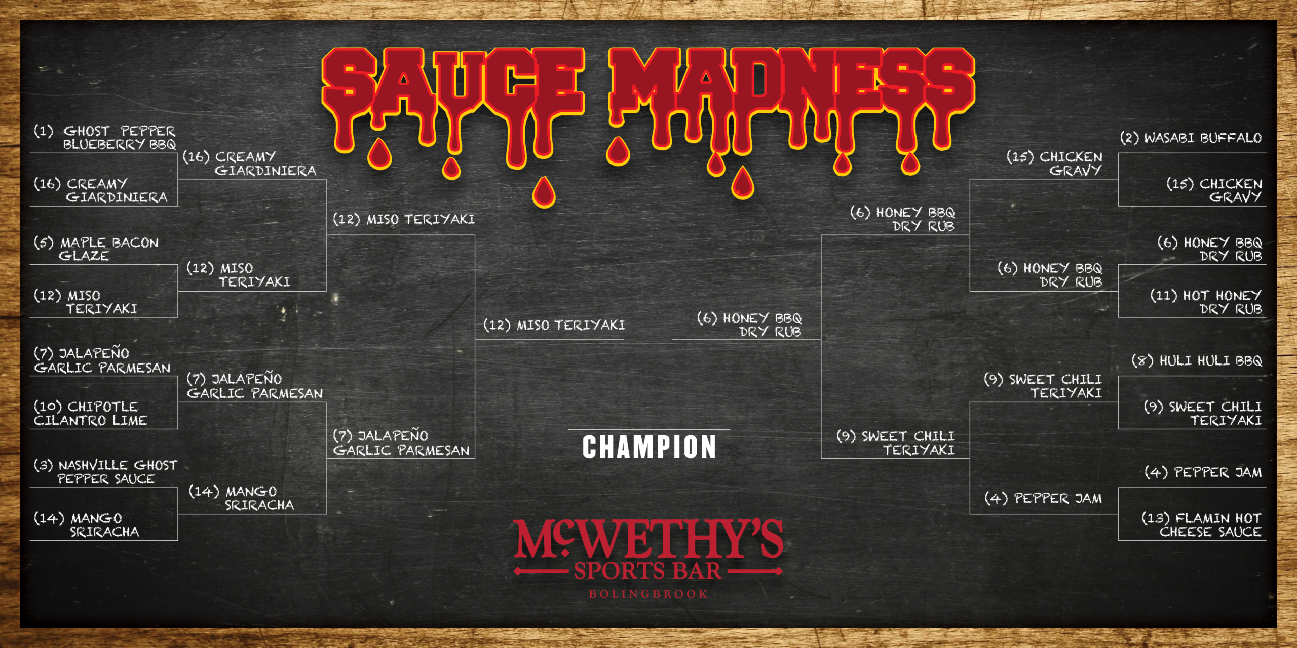 In the spirit of the NCAA Tournament, we created 16 sauces to go head to head in an epic bracket style tournament.  This is SAUCE MADNESS!  16 epic flavors battle for glory and for a permanent place on our 2026 Sports Bar Wing Menu.  YOU will be the judge!